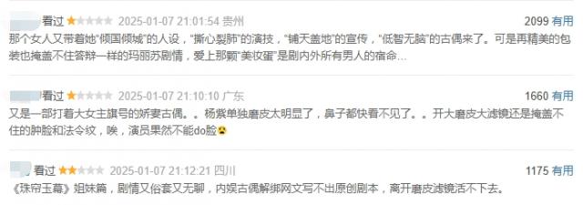 负面评价也是不可避免的。有网友认为这是一个老婆婆,喊着大女主的旗号。剧情老套无聊,有的吐槽玛丽苏的剧情,有的吐槽玛丽苏的剧情。 diss 研磨皮肤和滤镜。