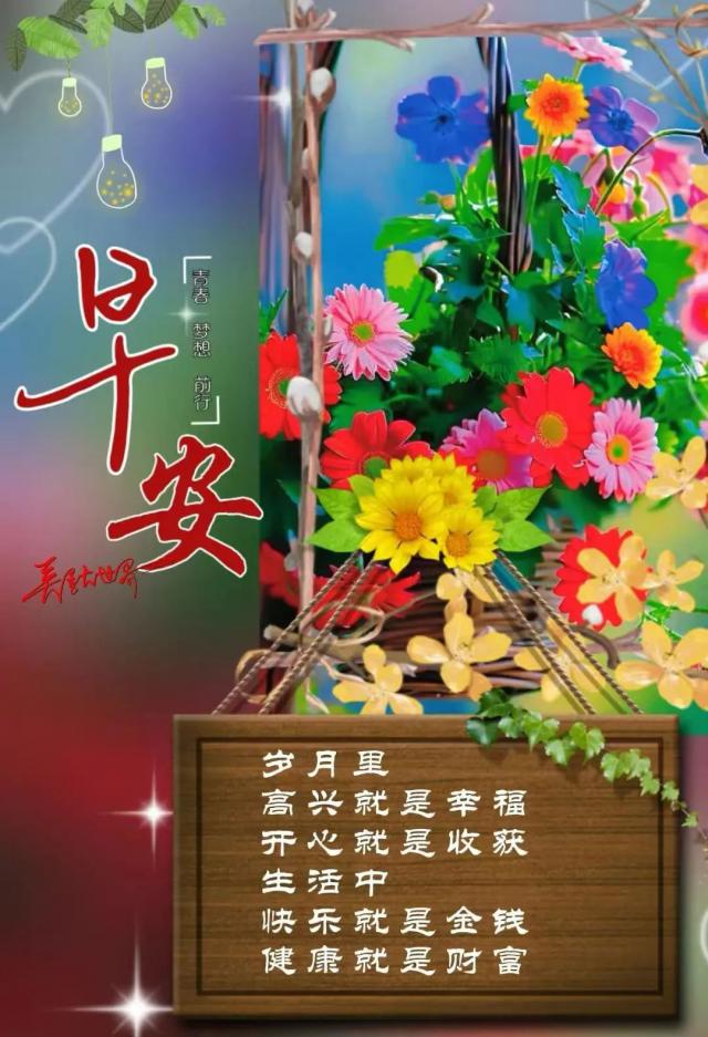生活是一半的烟花,一半的快乐;生活是一半的清醒,一半的放手。不管天气如何,给自己的世界一个阳光;不管季节如何,让自己心中的鸟语花香。祝大家幸福,岁月芬芳,早上好运!