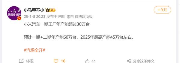 博主:2025年小米汽车工厂最高产能估计约45万台。