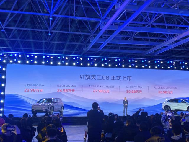 1 月 7 日,一汽红旗宣布,天工 08 正式上市。新车提供三款单电机后驱和两款双电机四驱五种款式。参考价格区间为 23.98 万 -33.98 万元。