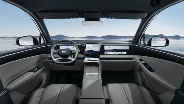在内饰方面,该车中控台配备了由液晶仪表盘和多媒体显示屏组成的连体式屏幕,中控台采用皮革包裹。 / 缝线处理和木纹装饰板。其车内开门方式为按键式,取消内侧物理门开启把手,手机无线充电和下部镂空收纳空间出现在辅助仪表板区域。
