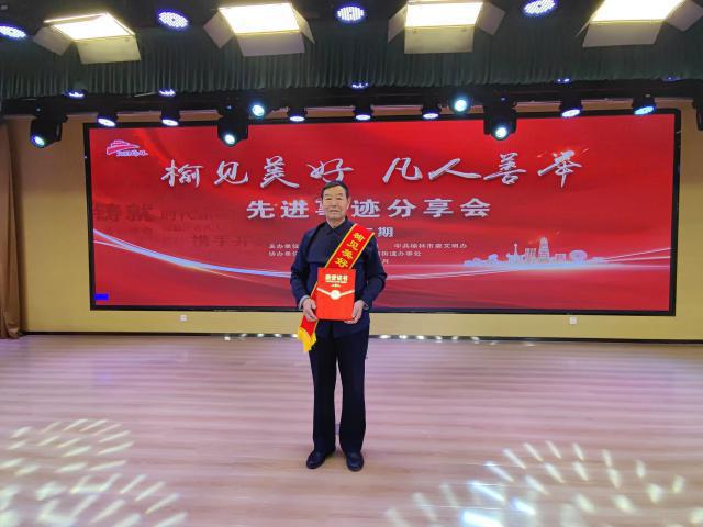 近日,由中共榆林市委宣传部、中共榆林市委文明办主办,榆林市榆阳区明珠路街道办事处协办。 " 榆见美好 凡人善举 " 第二届先进事迹交流会召开。会上看了凡人善举先进事迹短片:凡人善举先进典型分享了个人经历和心路历程;表彰 " 榆见美丽凡人善举 " 榆林佳县陈兆荣在第二期先进典型中获得了这一荣誉。