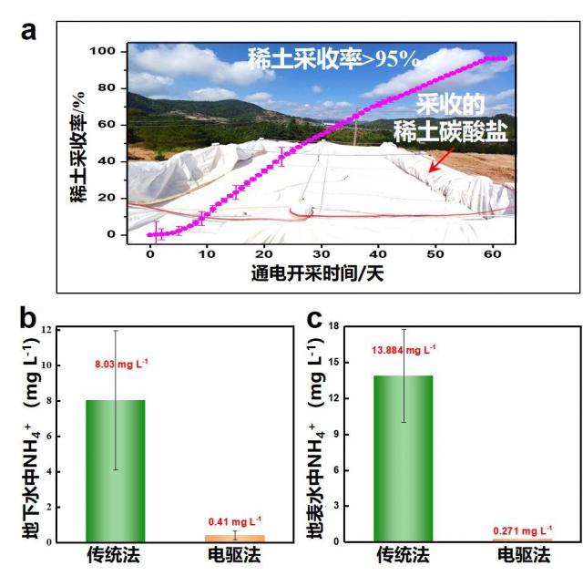 通过 60 在工业试验中,天通电采掘的稀土采收率已达到 95% 以上(图 2a)。环境监测结果表明,与传统开采工艺相比,地下水和地表水中的氨氮消耗降低 95%(图 2b,2c),极大地减少了稀土开采的环境影响。