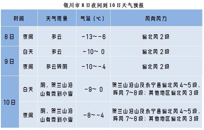 预计8日晚至9日,银川市以多云天气为主,气温持续较低;10日,贺兰山沿山有小雪,贺兰山沿山及永宁县有4条。~5级偏北风,阵风7~8级。