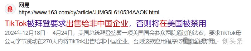 最早,TikTok的困境始于2024年4月美国政府通过的一项法案,要求TikTok在270天内切断与总公司字节跳动的关系,或者将其出售给非中国公司,否则将在美国完全禁止。
