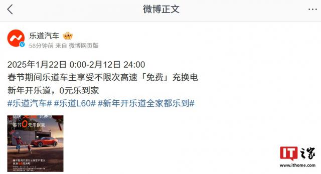 据 IT 今天早些时候,世家报道称,乐道汽车官方也发布消息称,除了运营车辆,乐道车主可以在春节期间(2025年 年 1 月 22 日 0:00-2 月 12 日 24:00)享受无限高速「免费」充换电。