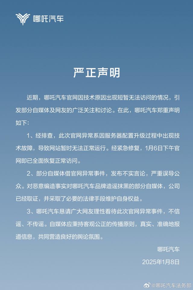 2、一些自媒体通过官网异常事件发表虚假言论,严重误导公众。公司取证,并制定了必要的法律手段来维护自己的权益,以恶意编造事实,抹黑哪吒汽车品牌的谣言。
