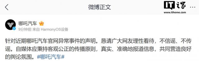 哪吒汽车:恳求众多网友理性看待此次官网异常事件,不信谣不传谣。