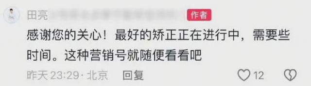 田亮没有发酵多久,就在评论区回复了网友,“最好的矫正正在进行,需要一些时间”。
