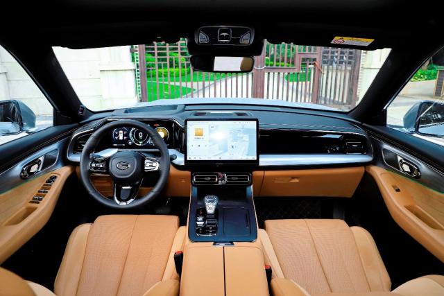 传祺 GS8 车内设计走的是豪华路线,从皮革包裹到缝线包装和配色,都有很强的高档质感。中控台上有两个大屏幕,其中高通骁龙内置触摸屏 8155 可以提供芯片 4G 汽车联网,语音识别,蓝牙连接,APP 远程控制、OTA 升级等功能,实用性高。