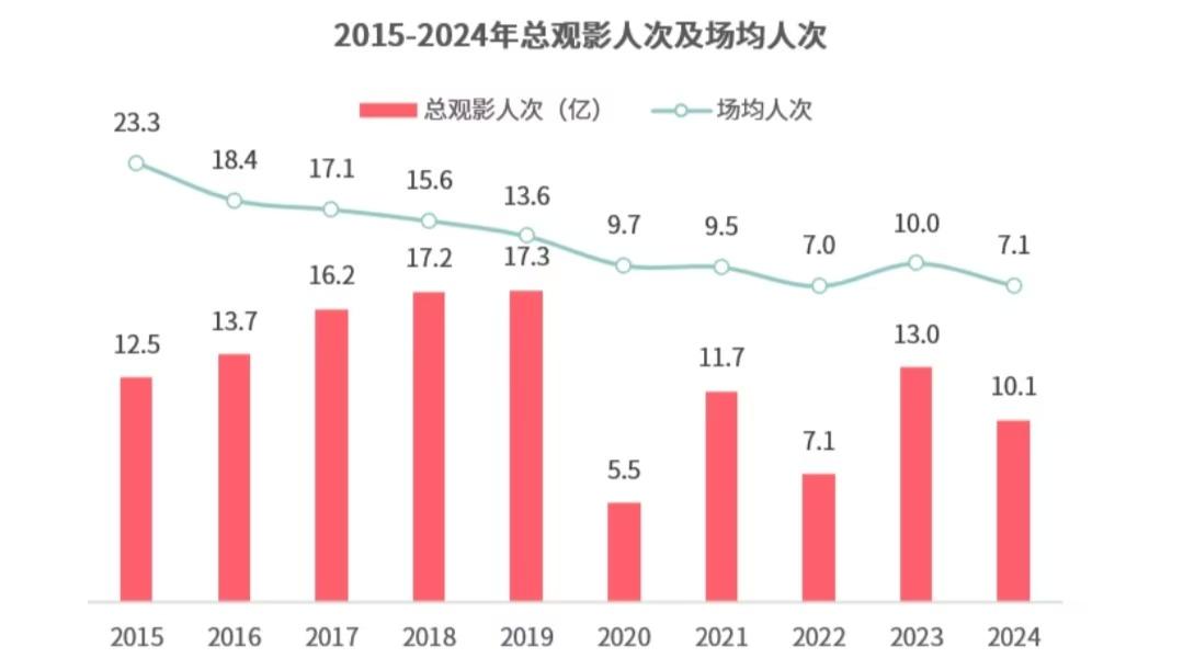 就屏幕数量而言,2024年全国屏幕数量为75,000,而2015年只有34,000。屏幕数量翻了一番,票房却低了十几亿。根据猫眼数据报告中显示的场均人数,2015年场均人数为7.1人,而2015年场均人数为23.3人。,这是它的三倍多。