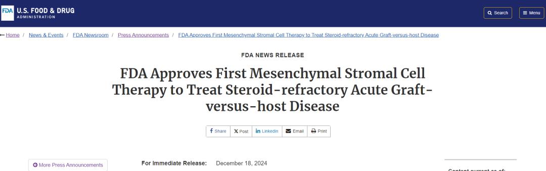值得注意的是,2024年12月18日,美国美国食品药品监督管理局在这款干细胞产品获得批准之前,(FDA)也批准了第一种基于胚胎干细胞的治疗方法——Ryoncil(Remestemcel-L),这种治疗方法专门用于治疗类固醇难治性aGVHD。