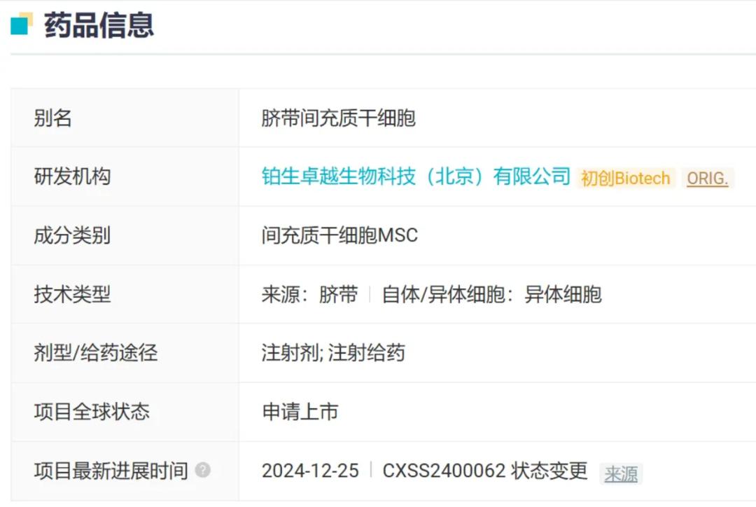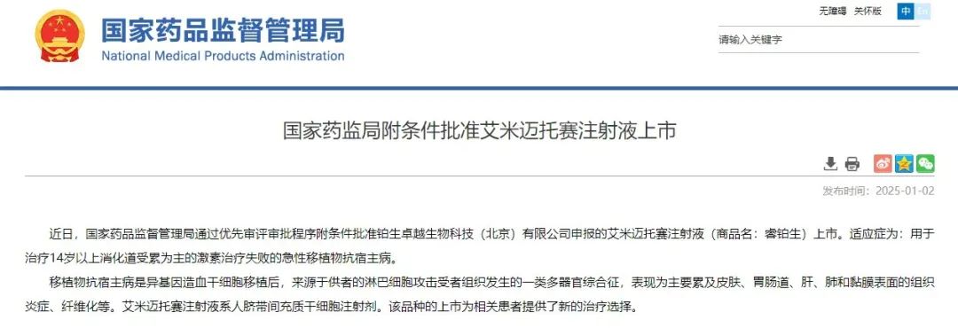 2025年1月2日,中国艾米迈托赛注射剂获批上市,成为中国第一种干细胞药物。据悉,该药物由铂生卓越生物科技(北京)有限公司开发,主要适用于超过14岁的aGVHD患者,主要是消化道受累导致的激素治疗失败。,填补了国内干细胞治疗药物的空白。
