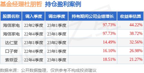 西部利得新富混合和杜朋哲管理 A 基金在 22 年 2 季度购买海信家电,拥有海信家电 3 个季度后在 23 年 1 季度销售。所有期间的估计收益率为 拥有海信家电的44.22%。 2022 年至 2023 年度报告归属净利润增长达到 97.73%。