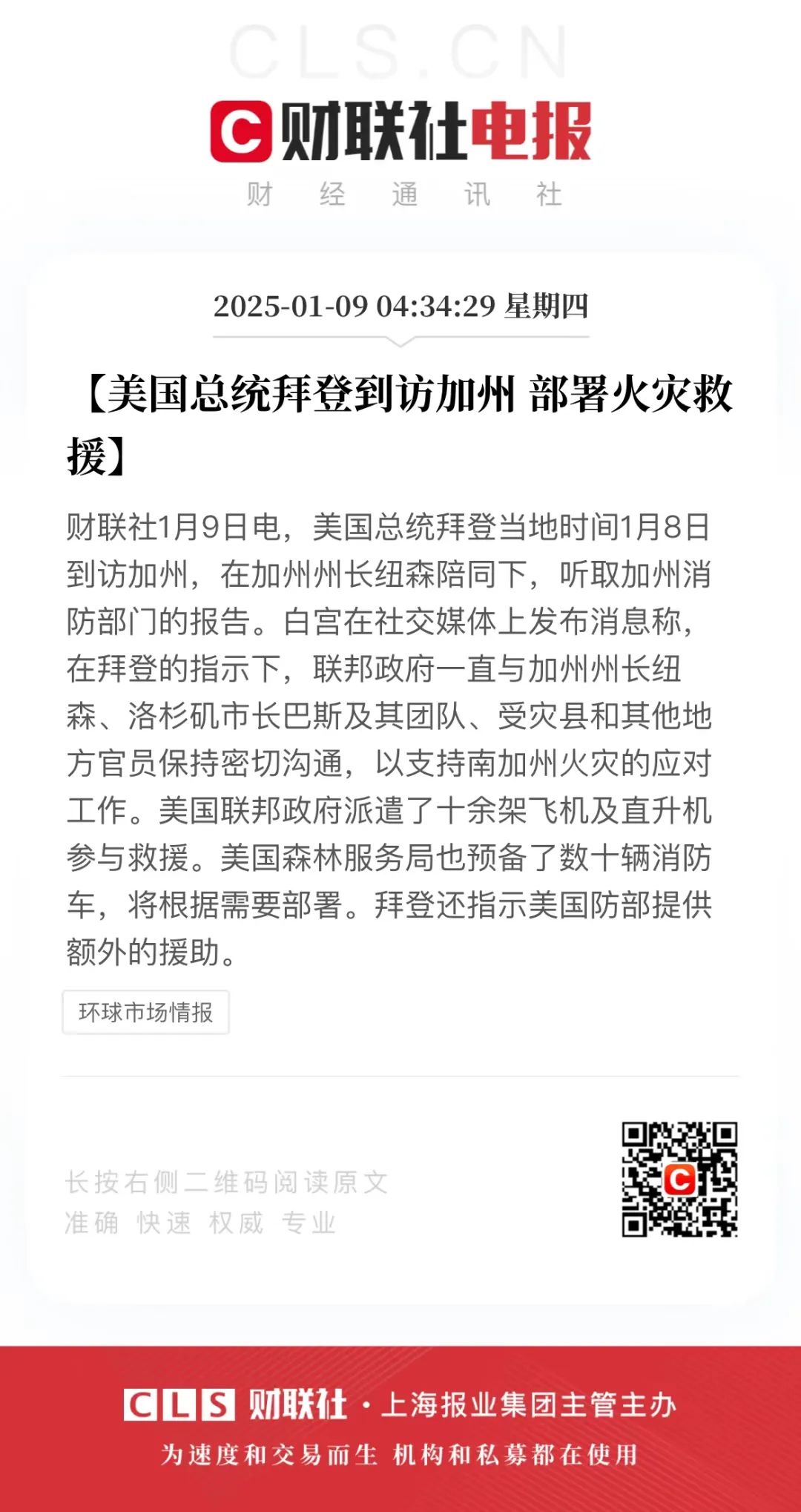 当地时间1月8日,美国总统拜登来到加州,在加州州长纽森的陪同下,听取了加州消防部门的报告。白宫在社交平台上发布消息称,在拜登的指示下,联邦政府为了支持南加州火灾的应对,一直与加州州长纽森、洛杉矶市长巴斯及其团队、受灾县及其他地方官员保持密切沟通。