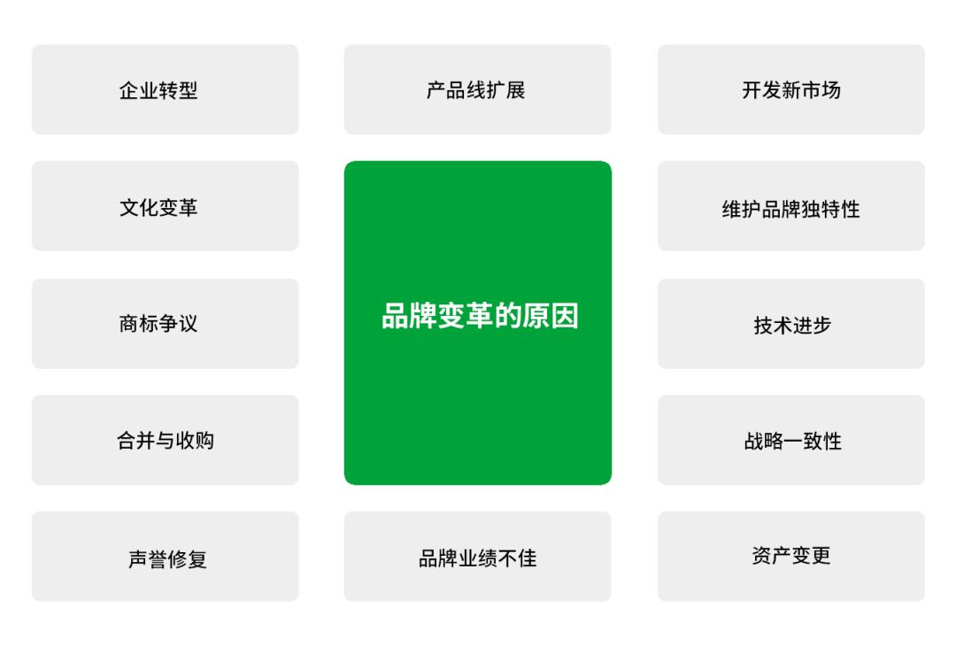 一个品牌在成立之初可能与企业和产品非常匹配,但随着时间的推移,它可能会逐渐变得不再适用,尤其是在企业转型过程中,或者产品服务超过了最初的定位、名称、识别技术或信息传递方式时,。