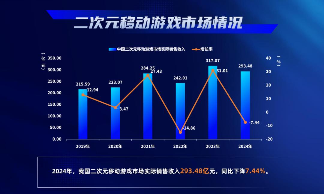 就主题而言,二次元无疑是2024年最惨淡的赛道。据《2024年中国游戏产业报告》显示,2024年国内二次元移动游戏市场的具体销售收入从去年的317.07亿元下降到293.48亿元,增长率为-7.44%。此外,据不完全统计,去年有26款二游停运,其中18款产品从上线到宣布停运不到两年,3款二次元项目在上线前被砍掉。