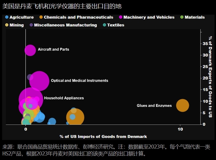 相比之下,丹麦仅占2023年美国进口总额的0.4%。而且在产品层面,美国对丹麦的依赖程度也非常有限(以丹麦在美国单一商品进口中所占的比例来衡量)。