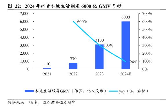 36 之前已经报道过氪, 2024 抖音生活服务在几年前八个月完成。 3200亿的 GMV ,直接超了 2023 全年,但 36 事实上,氪金和国泰君安证券的信息来源也表明, 2024 年的目的是 6000亿 GMV 。