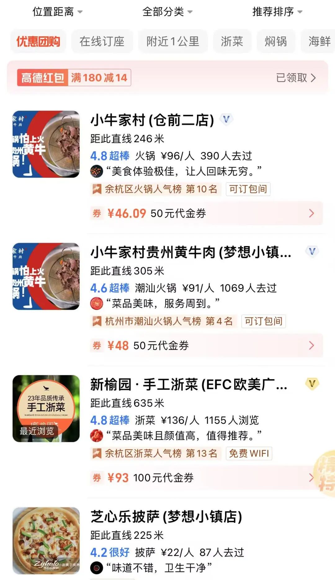 理想情况下,顾客用高德导航到餐厅吃饭,顺手在餐厅吃饭。 App 上面还买了团购券,所有的需求都在高德上处理。