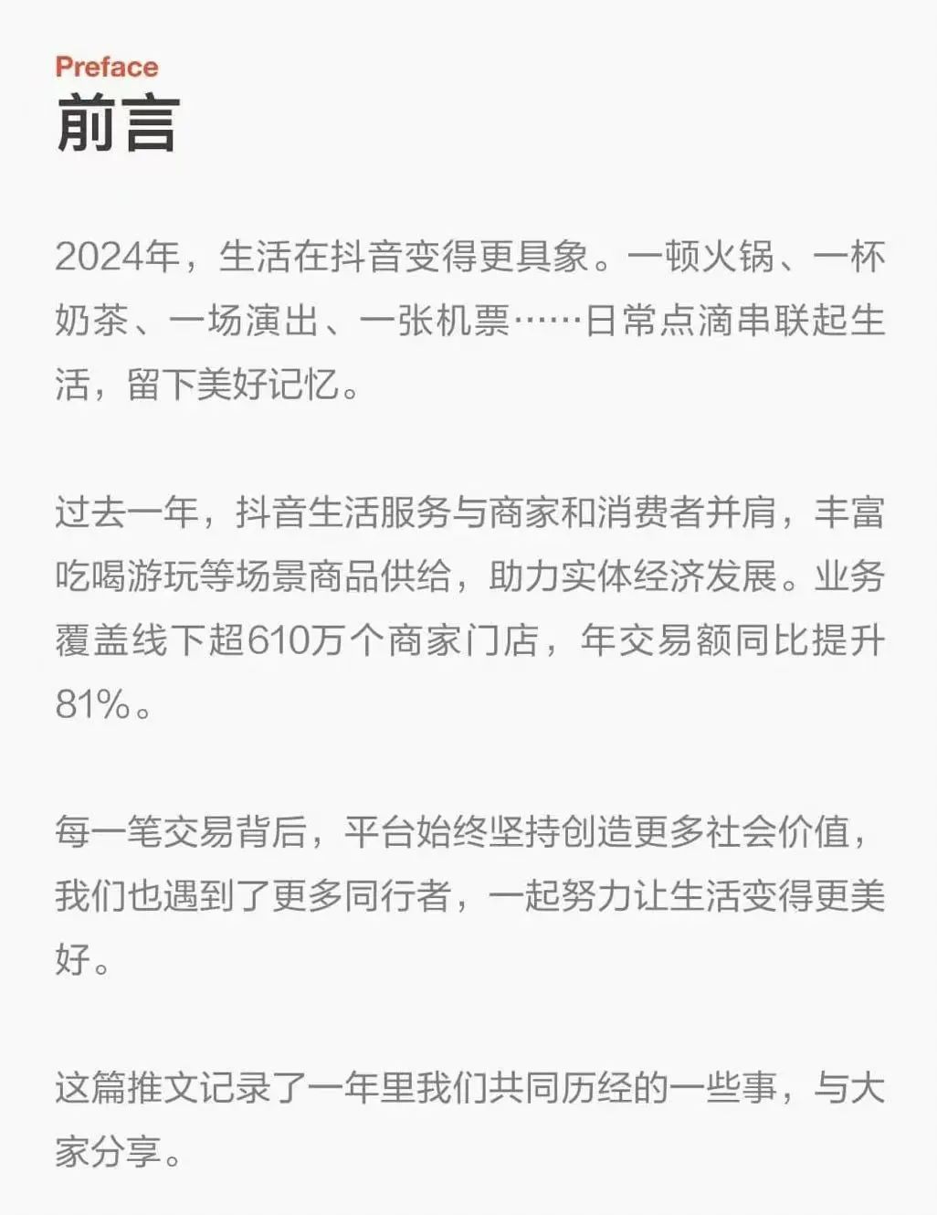 包括抖音生活服务平台在内的公布, 2024 年营业额同比增长 81%。