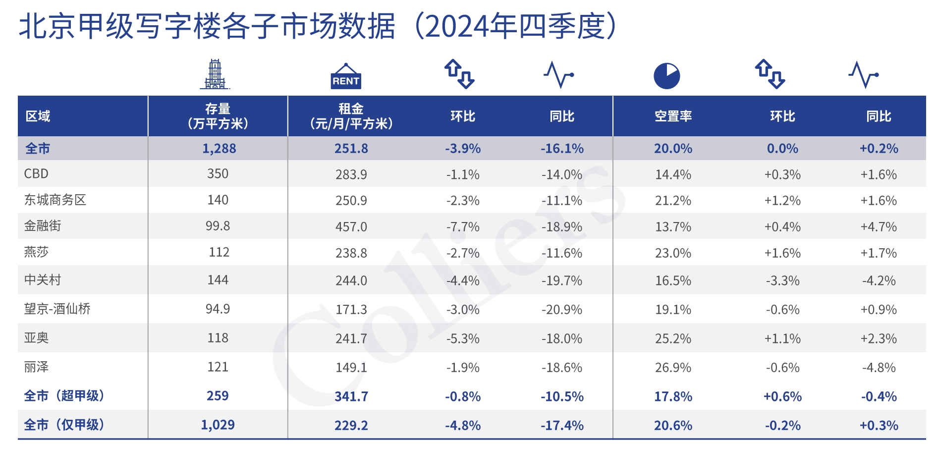 由于空置率的持续增长和甲级、乙级写字楼项目租金差异的不断缩小,各子市场和跨资产类别之间的竞争不断加剧,导致商业区写字楼租金在中关村、金融街等市场需求依然旺盛的地区大幅下调,部分高租率项目价格开始松动。