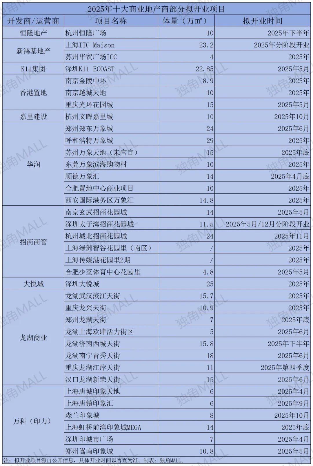 随着2025年的临近,独角Mall未完全统计出恒隆集团、新鸿基地产、K11集团、香港置地、嘉里建设、华润、招商管理、龙湖商业、大悦城、万科(印力)等10家商业地产开发的36个重点商业项目,商业规模超过435万平方米。