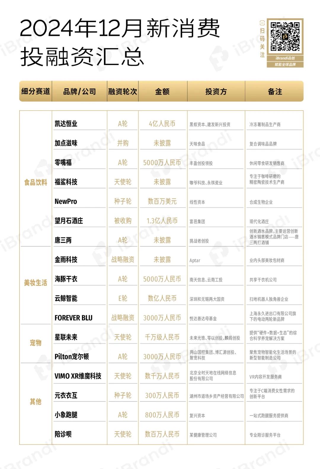 根据iBrandi产品创造不完全统计,2024年12月共有17个新消费项目披露完成融资,与1024年12月相比,、十一月的六起和四起,可以用明显的增长来形容。