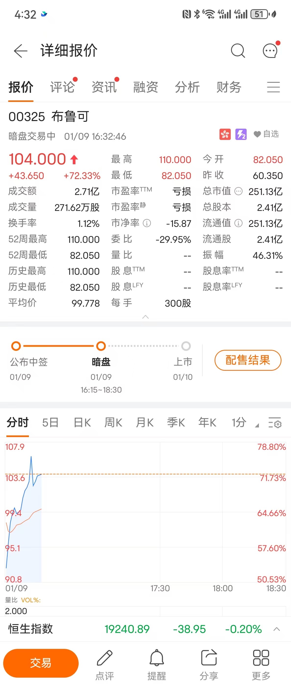 布鲁可开盘一度暴涨72%,每股104港元,对应市值251亿港元。一手中标可以赚14,000港元。