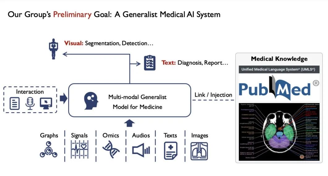 团队希望在建立通用模型时,将获得的所有多模态数据联合训练,包括图像、文本、基因组学、ECG 信号等。,并以影像中的疾病定位、文本级诊断和报告作为最基本的导出方法。在训练过程中,在实现通用功能中,医学常识的嵌入也是必不可少的一环。「这是因为医院很多科室的任务不一样,医生往往更注重自己的部分。我们希望通用模型能够覆盖所有的检查信息,在处理任务后形成循序渐进的思维链,完成识别诊断等任务。」,谢伟迪介绍道。