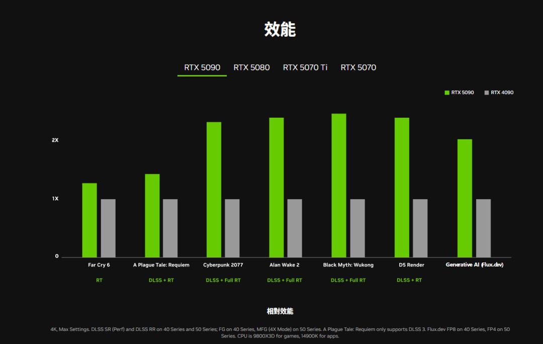 英伟达今年发布的50系显卡并没有得到很大的改善。排除英伟达不准确的比较技术(如测量AI,两侧精度不同)后,我们可以看到50系列显卡基本上提高了30%的堆放性能。在演示过程中,由于Transformer对DLSS(深度学习很取样)技术的优化,帧数性能差异很大。英伟达解放了生成式AI的预测能力,将计算画面由原来的“两帧中间插一帧”改为“两帧中间插三帧”。