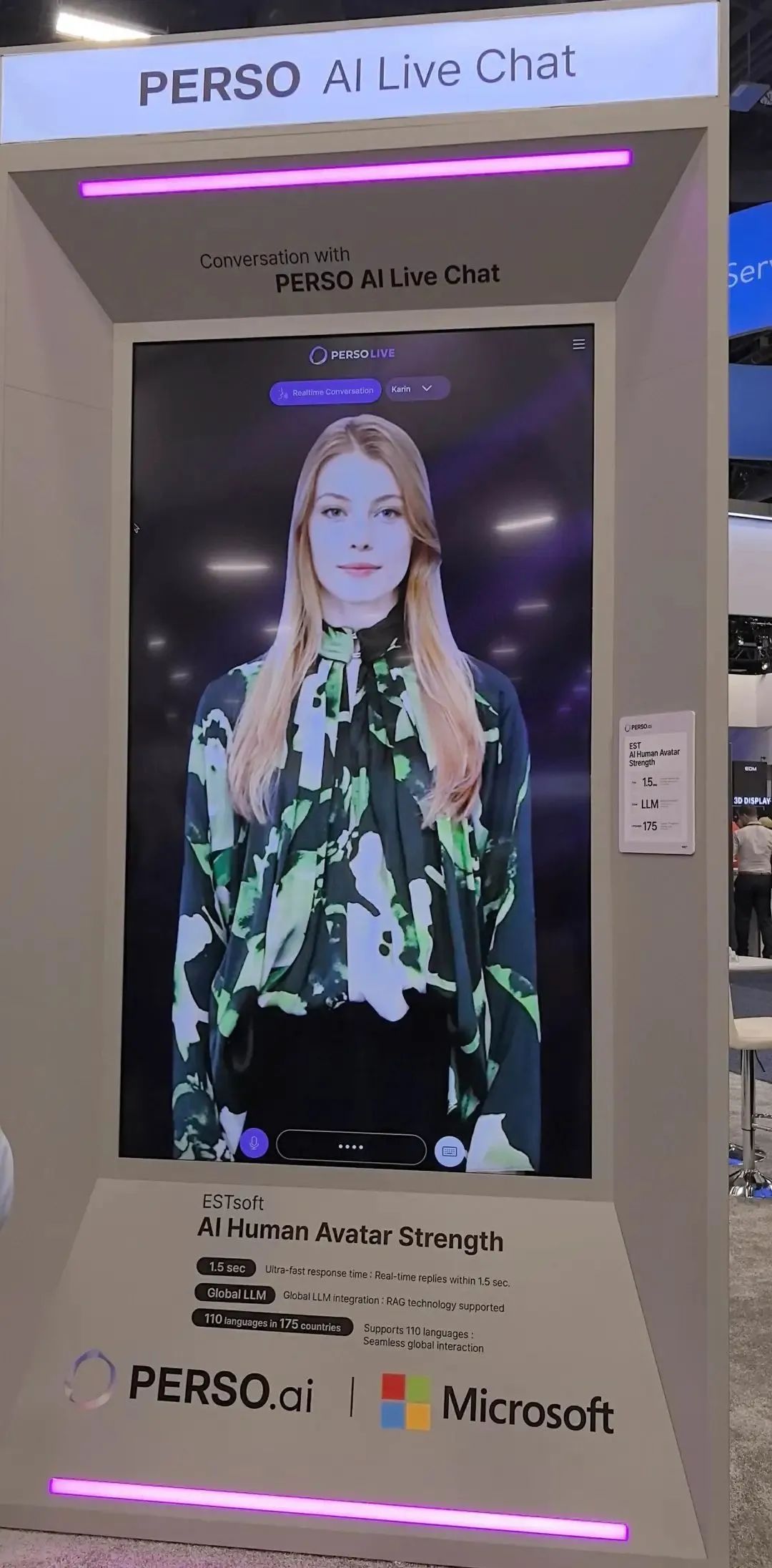 PERSO是AI虚拟人的最新进展。.ai与微软合作推出了一款AI虚拟人屏,可以即时交互。通过大模型的调整,交互延迟控制在1.5秒。看来之后商场里的“柜哥柜姐”需要压力。
