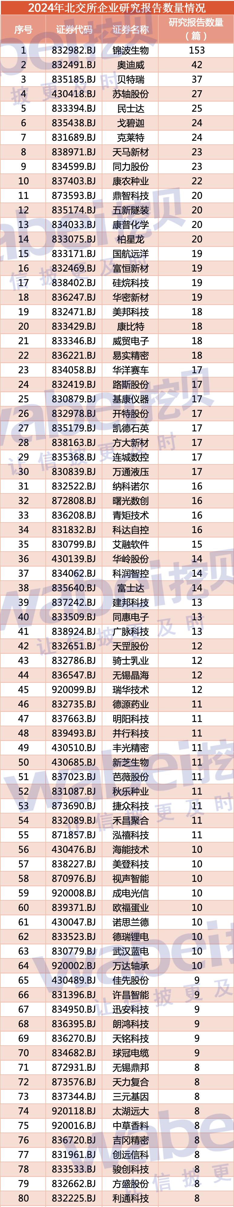 据不完全统计,2024年北方证券交易所上市公司的调查报告总数约为1600份。北方证券交易所263家上市公司中,去年有183家公司的研究报告,约占70%。其中,锦波生物的研究报告数量最多,有153份,远远超过其他公司。