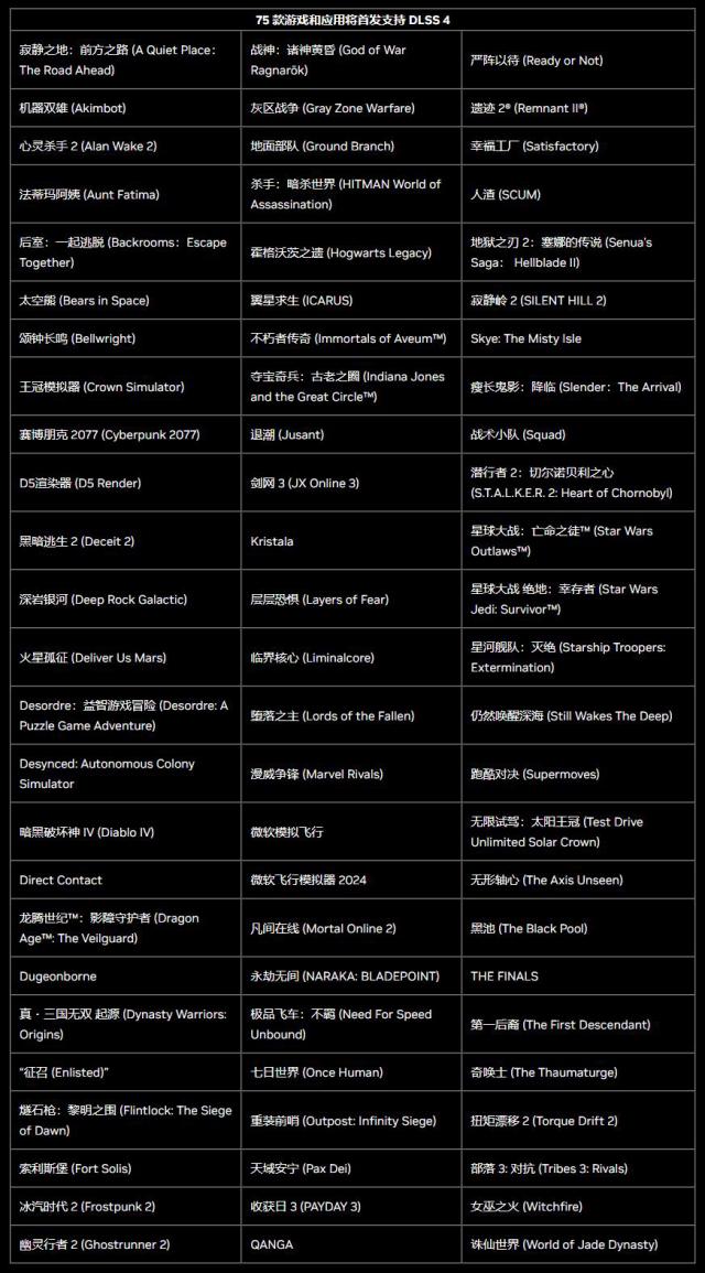 当前首发支持 DLSS4 的有 75 一款游戏,《黑神话:悟空》其实并没有在首发中,但官方表示要支持的,最多只是一点点等等。