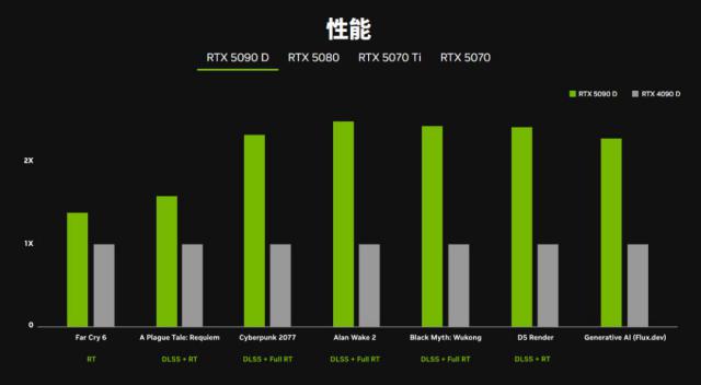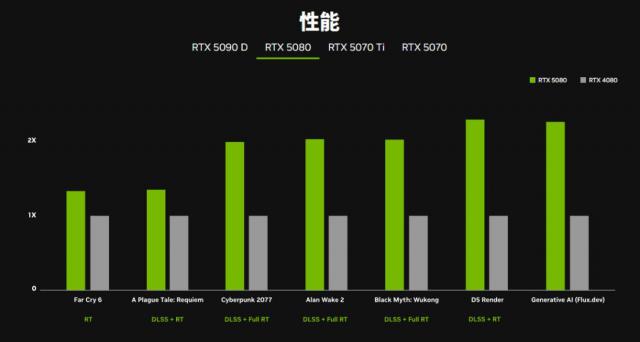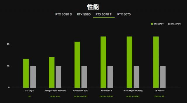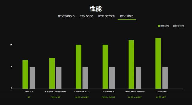 从 NVIDIA 根据官方公布的数据,在只打开光追的情况下,RTX 5070 大概比 RTX 4070 强 30% 没有,但是正在打开 DLSS(这里显然 RTX 5070 用的是 50 系独享的 支持新多帧生成技术的DLSS4)之后,《黑神话:悟空》《D5》 Render》性能差不多就是这样 RTX 4070 超过两倍。所以,老黄这里说的 RTX 5070 比肩 RTX 4090,显然是通过了。 DLSS4 …但这种比法也不是第一次了,你猜为什么老黄的? DLSS4 只给多帧生成 RTX 50 系独享?