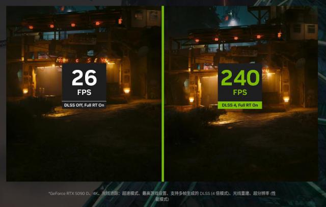 根据官方数据,RTX 5090 D 在 4K 在极限画质光追全开的情况下跑“赛博朋克” 2077》,不开 DLSS 只有 打开26fps DLSS4 以后暴增到 260fps ....除了超分辨率带来的帧率提高外,这里至少有100帧。 AI 计算,问你是否害怕。也许玩家要担心,AI 插入这么多帧,难道不怕帧延迟暴涨吗?没事的,老黄这不是给你带来的。 NVIDIA Reflex 2 吗。