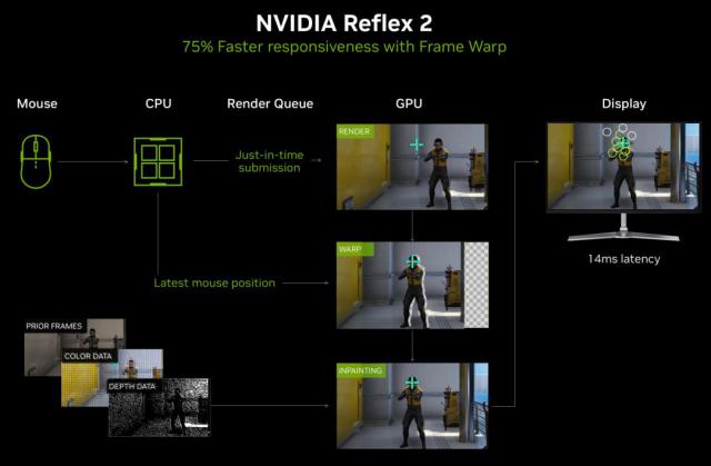 Reflex 每个人都熟悉一代技术,Reflex 2 加入新的 Frame Warp 通过对延迟进行优化的预测渲染算法, GPU 将渲染帧发送到显示屏前,根据最新的鼠标输入信号进行更新,从而减少游戏延迟。根据官方数据,可以减少。 75% 的延迟。通过这种方式,多帧生成带来的延迟增长可以在一定程度上被刮平。自然,具体效果如何还不得而知,还要等待实测。