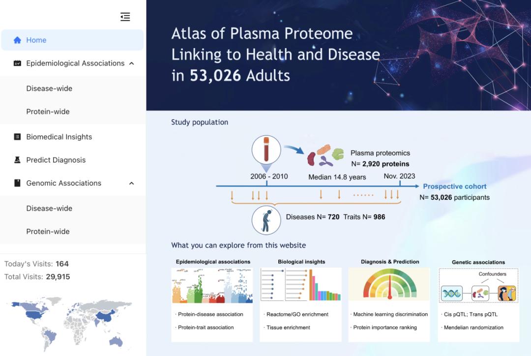 在研究成果的基础上,团队建立了一个可以开放访问的蛋白质组-表形组资源数据库Proteomeome-Phenome Atlas(https://proteome-phenome-atlas.com/)。在数据库上线的第一周,就有数万个访问者来自世界各地。