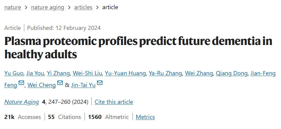 2024年2月,团队发布了《自然·衰老》(Nature Aging)血浆蛋白组学预测健康成年人未来痴呆症的风险(Plasma proteomic profiles predict future dementia in healthy adults)研究,它代表着“一滴血可以提前15年预测痴呆症的风险”,被《自然》(Nature)报道作为头条新闻,引起了学术界的高度关注。