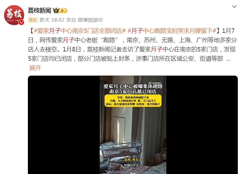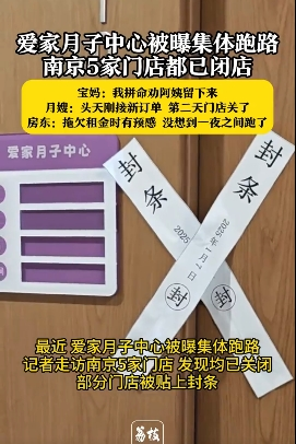 一月七日,有网友在社交平台上发视频称,品牌连锁的爱家月子中心空无一人,自己一觉醒来就什么都没有了。