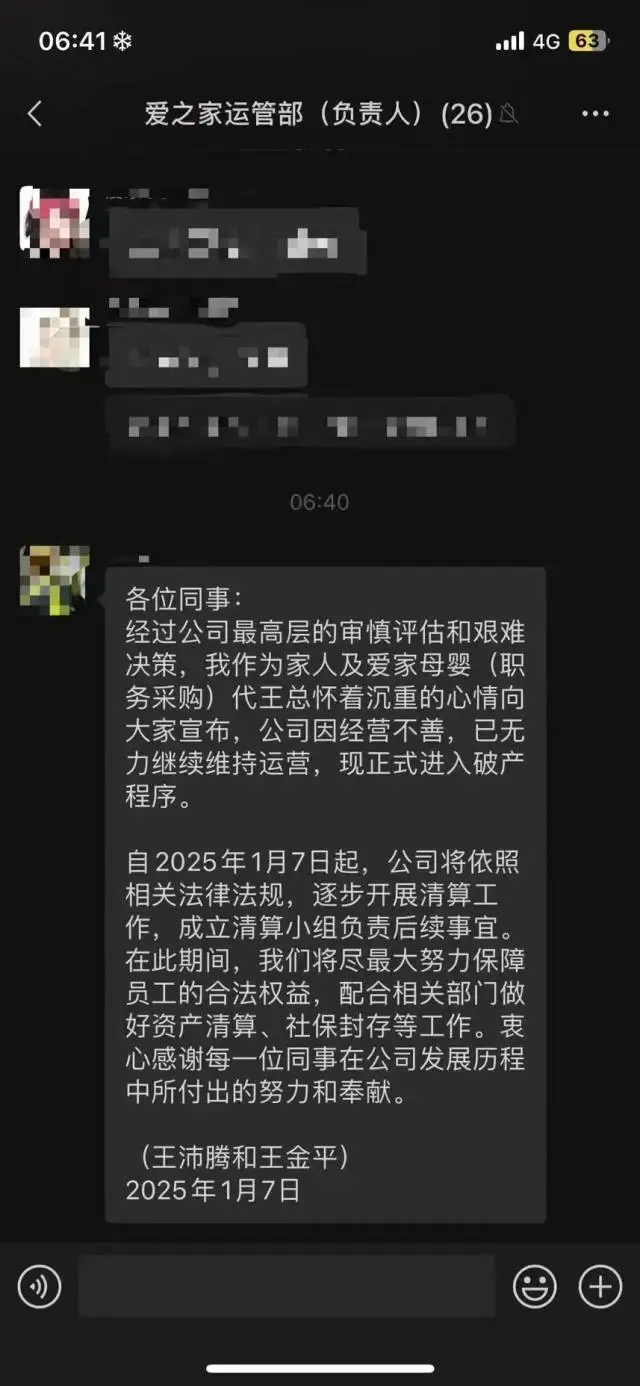 一群被签名为“王沛腾和王金平”的消息说:“经过公司最高管理层的审慎评估和艰难决策,我作为一个家庭成员,一个热爱家庭的母婴(岗位采购)代王,总是怀着沉重的心情向大家宣布,公司因为经营不善,无法继续经营,现在正式进入破产程序。”