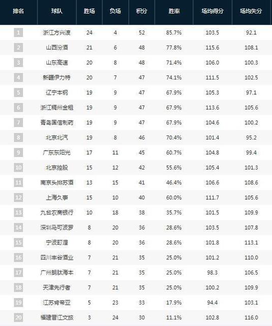 目前,辽宁男篮、浙江男篮、青岛男篮三支球队, 19 胜 9 目前,负记录分别排名第五至第八。辽宁男篮是卫冕冠军。前段时间阵容问题比较大,但是随着帕顿的到位和韦伯的加入,球队的情况好了很多,接下来的表现肯定会越来越好。