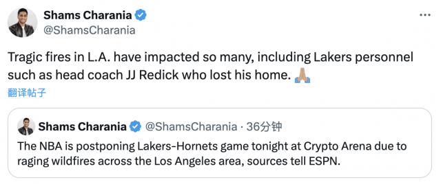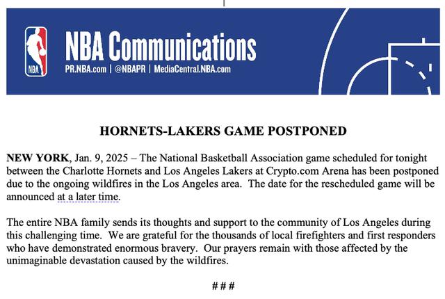 NBA官方宣布:湖人队主场与黄蜂一战因洛杉矶山火延期 湖人队正式发表声明