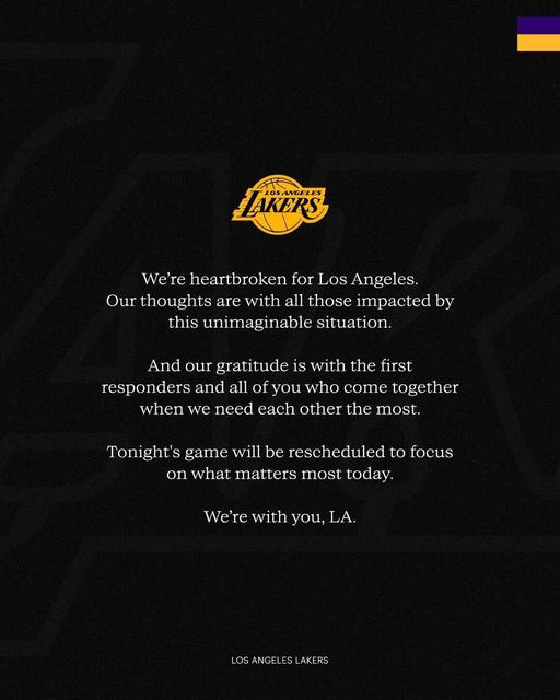“我们为洛杉矶感到心碎。我们和所有受到这种不可想象的情况影响的人在一起。我们感谢所有在我们最需要的时候与急救人员团结在一起的人。今晚的比赛将重新安排,致力于今天最重要的事情。洛杉矶,我们和你在一起。”