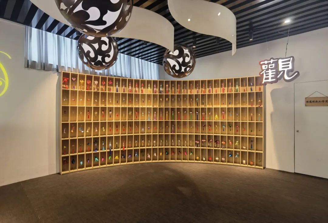 “观”:整个香囊墙由180种不同风格的香囊组成,形状从动物到水果,材质由纱质到木质,浓缩了数千年的香囊变化。
