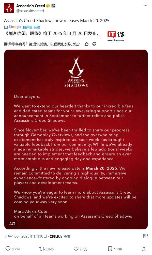 育碧游戏《刺客信条:影子》再次跳票 3 月 20 日发行