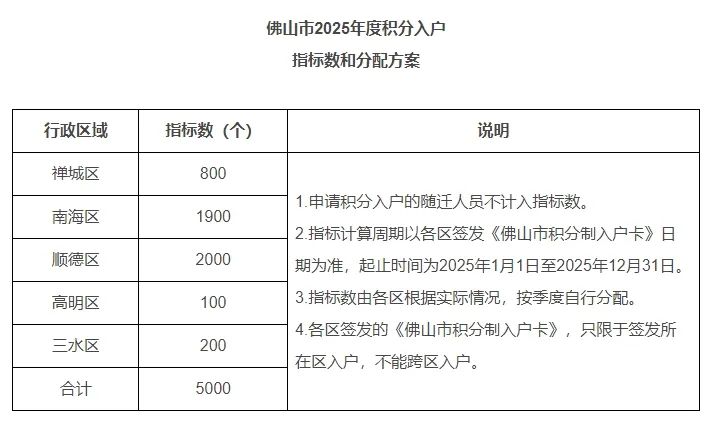 近日,《关于做好2025年佛山市积分结算指标和分配方案的通知》发布。2025年,积分结算指标为5000个,其中禅城区800个,南海区1900个,顺德区2000个,高明区100个,三水区200个。>>点击了解积分结算指南