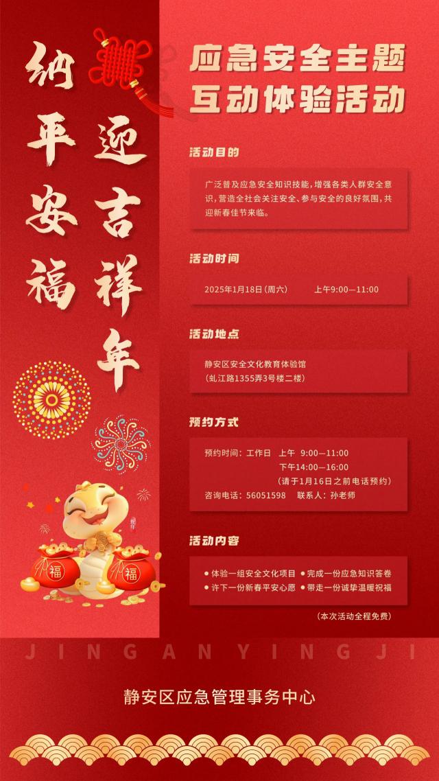 为了不断推动安全常识进入机关、企业、社区、学校,不断提高全民安全素质,筑牢安全防线,营造“人人讲安全,人人紧急”的良好社会氛围。值此春节之际,静安区安全文化教育体验馆邀请您参加"纳平安福 迎吉祥年“应急安全主题互动体验活动”,共同开启安全祥和的新年。