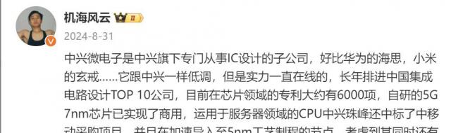 据微博大 V 据透露,中兴旗下也有专门的专业人士。 IC 中兴微电子是一家著名的设计企业,多年来一直位列中国集成电路设计前十。它和中兴总公司一样低调,在芯片领域获胜。 6000 多项专利,应用于服务器领域 CPU 正是他们自己开发的;
