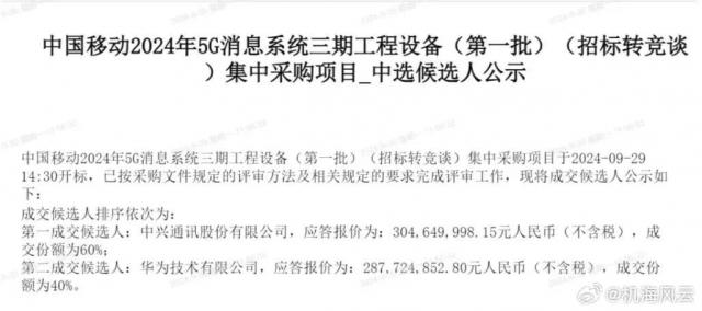 再往前走一个月,中国移动。 2024 年 5G 在新闻系统三期工程设备集采项目中,中兴获得了工程设备集采项目候选人的公示。 60% 份额排名第一,比华为份额排名第二高。 20%,说全国领先不过分吧?